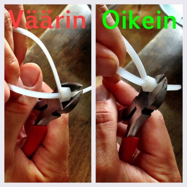 Väärin katkaistut nippusiteiden päät ovat teräviä. Ne repivät helposti ihon ja vaatteet. Jos joudut leikkaamaan nippusiteen ylimääräisen osan pois, tee se aivan lukon vierestä. Sivuleikkureilla leikatessa käännä terän tasainen puoli…