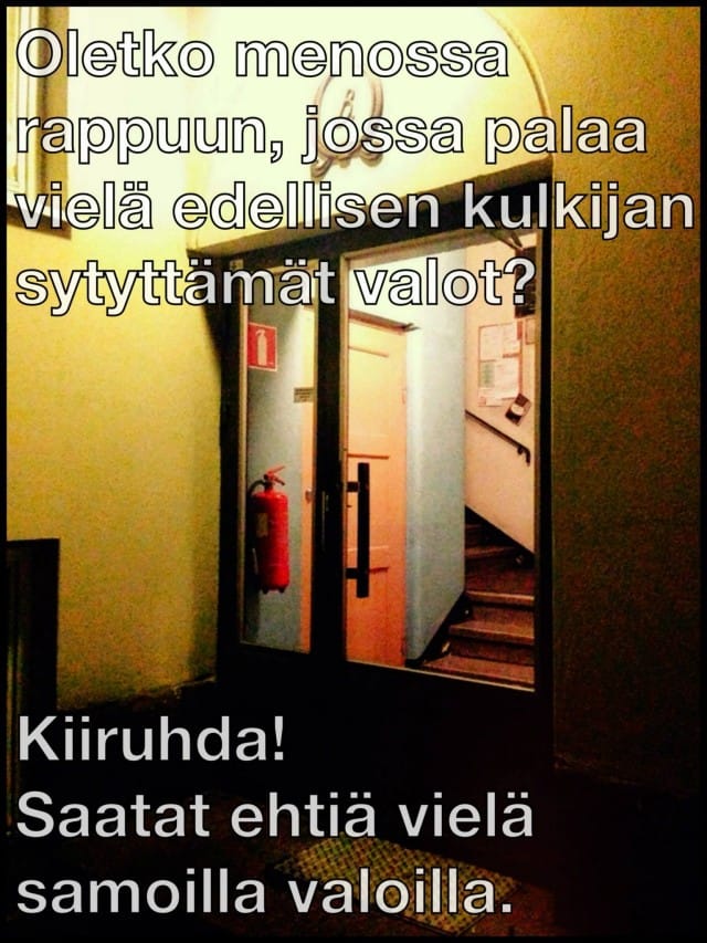 Vanha läppä, mutta mieti hetki ennenkuin käytät hissiä. Portaiden käyttö on hyvää liikuntaa, jos pumppu ja koivet vaan toimii. Samalla säästät sähköä. + Jos kiiruhdat, voit ehtiä ylös tai alas…