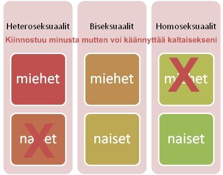 kuva 3 ne jotka voivat kiinnostua minusta mutta joista minä harvemmin kiinnostun Joten kun sitten en huoli jonkun kännisen heterohoron pildee taksi jonossa mutta se hetero poika voisi kiinnostaa olenkin yllättäen homo? No siltä se voi tuntua siinä silloin, mutta totuus on kaukana tästä. Kun torjun +50v homomiehen lähentelyt uimahallissa, olenkin homovihamielinen heterojuntti. Haa mutta kun harrastan vaimoni ja tyttö-/poikaystäväni kanssa yhdessä kaunista, hellää ja rakastavaa seksiä olenkin ällö perverssi ja lopuksi piste i:n päälle. Kun päästän seksuaalisesti yhtä sekavan vaimoni hakemaan identiteettiään seksuaalisuuden saralta, olenkin vain yksinkertaisesti tyhmä ja vedätettävissä. Mitä tämä opettavainen eläintarina kertoi meille? Ketään ei oikeasti kiinnosta vittujakaan sen biseksuaalin taipumus ellei se anna just sulle.