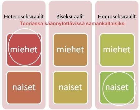 Biseksuaaliset ihmiset ovat usein kiinnostuneita VAIN toisista biseksuaalisista ihmisistä. Miksi näin? Koska heillä on biseksuaalisia seksifantasioita ja parisuhteen muodostustarpeita. Biseksuaaleilla voi olla jopa vaikeuksia elää hetero- tai homoseksuaalisessa parisuhteessa. Jotkut biseksuaalit kokevat hetero- ja homoseksuaalit yhtä seksuaalisesti vastenmielisinä kuin heterot kokevat homoseksuaalit tai homoseksuaalit kokevat seksin vastakkaisen sukupuolen kanssa. Ai, että miksikö näin? No sehän on luonnon oma jekku, tähän kaaviokuva aiheesta.