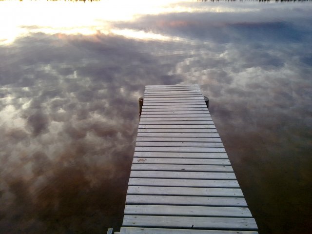 Mökkilaiturin päässä on taivas monella tapaa vahvasti läsnä.