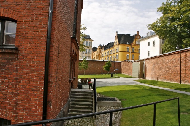 Päädyn hiekkakentälle, jonka vieressä näkyy punatiilirakennuksia. Yksi niistä on etsimäni hotelli, Katajanokan hotelli. Voin vain kuvitella, minkälaista elämä täällä on vietetty hotellin olllessa vielä vankila.