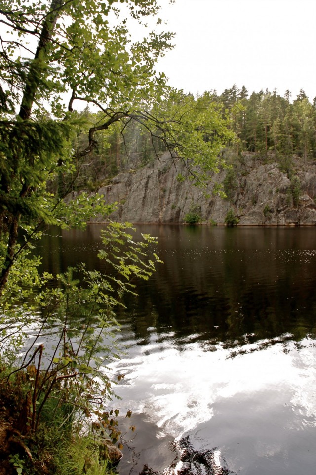Kiertelen Haukkalammen alueella ristiin rastiin. Lampi on kaunis. Kauempana näkyy jyrkkiä kallioseinämiä. Ihmiset uivat ja grillaavat. Täällä saa grillata vain siihen tarkoitetuilla alueilla.