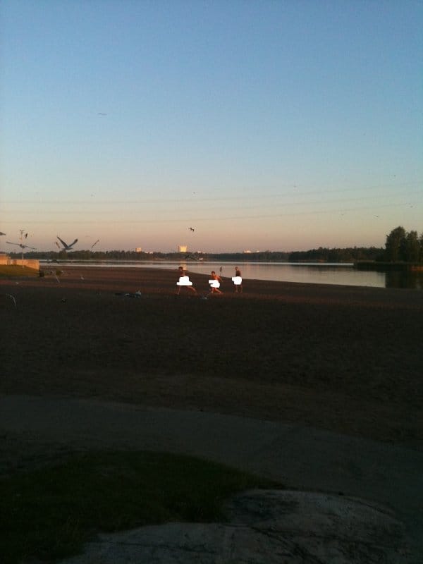 Hetken sipsejä mutusteltuamme rohkaistumme uinnille. Ketään ei näy missään ja uimahousuja ei ole, joten heitämme vaatteet isoon kasaan ja juoksemme veteen. Noin 10 sekunnin räpiköimisen jälkeen toteamme veden sen verran kylmäksi, että päätämme lopettaa uimisen ja mennä pukeutumaan. Tässä vaiheessa havaitsemme, että vaatekasamme päällä on noin 800 lokkia syömässä sipsejä. Kellot, kengät, housut, paidat aivan lokinpaskassa. Well done.