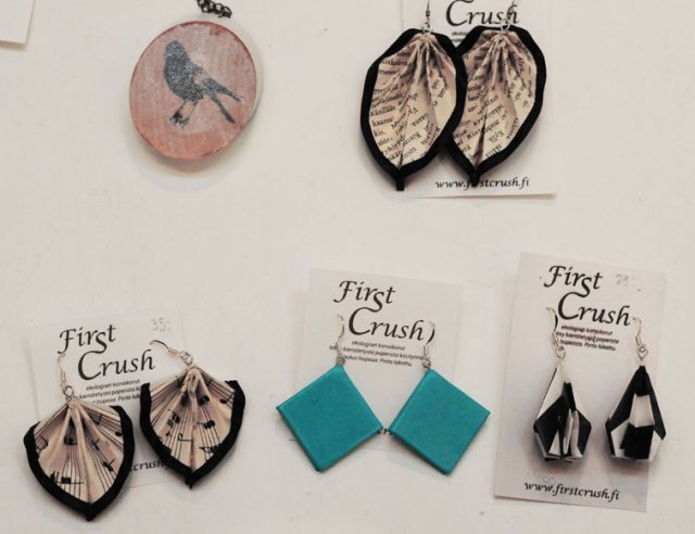 Mari Himmanen perusti vaate- ja asustemerkki [I]First Crushin[/I] vuonna 2006. Vaatteissa Himmanen käyttää etenkin kierrätettyjä miesten kauluspaitoja, koruissa kierrätettyä paperia kuten vanhoja nuotteja ja karttoja. Myös Himmanen paitsi suunnittelee myös valmistaa merkkinsä tuotteet itse. Ihailtavaa!