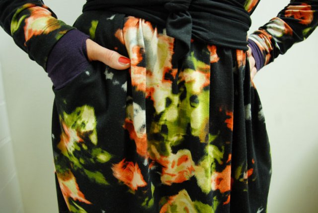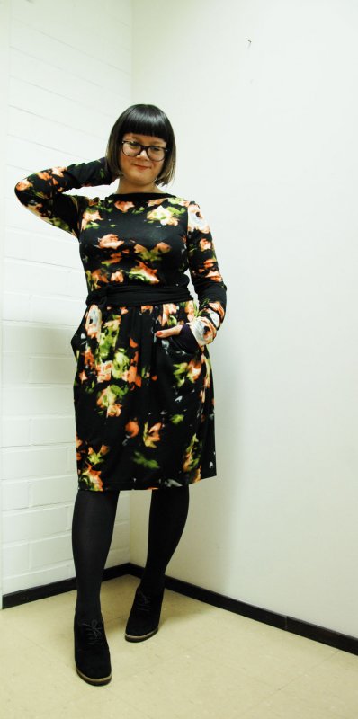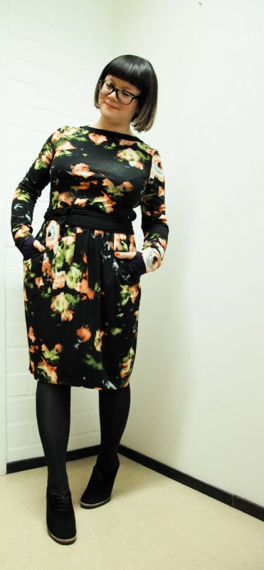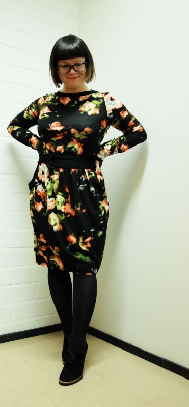 Naisellinen viskoosimekko on miellyttävä yllä, ja sen mittasuhteet ovat juuri sopivat, suorastaan täydelliset suhteellisen lyhyelle varrelleni. Erityisen viehättynyt olen mekon pitkistä, kapeista hihoista ja mustalla pohjalla olevasta modernista, maalauksellisesta ruusuprintistä. Ja [I]taskuista[/I]! Mekko, jossa on taskut, ei voi olla huono.