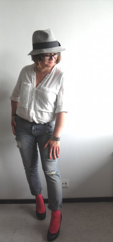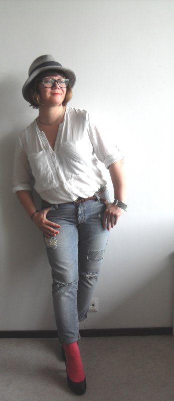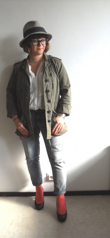 Tästä asusta löytyvät nuo kaikki naiselliset osaset ja itse asiassa aika monta pojilta lainattua vaatepartta: huopahattu, parka, valkoinen kauluspaita (tämä tosin on kaulukseton malli, joita ei miehillä näe) ja poikaystäväfarkut.