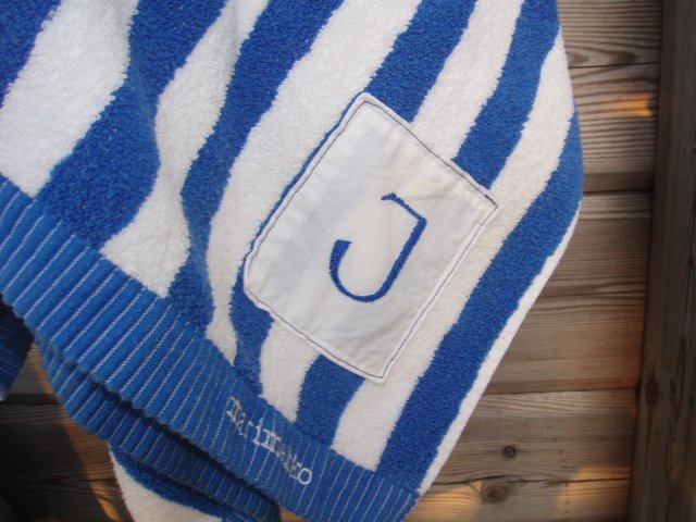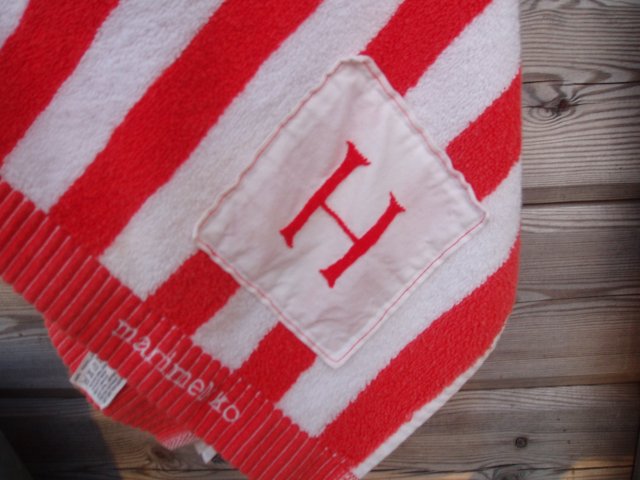 Eikä kirjailun tarvitse olla mikään koukero. Se sopii hyvin vaikka ”moderniin” Marimekon pyyhkeeseen, kuten kuvasta, jossa ovat poikani ja minun nimikoidut mökkipyyhkeet, näkyy. Nimikirjailua ja ja kirjainlapun ompelua ei ole suorittanut Mika Ihamuotila & co, vaan äitini.
