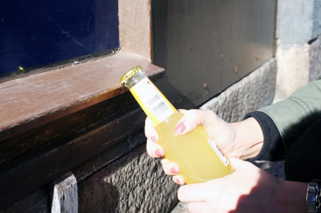 Otamme Breezerit ja käännymme Kustaankadulle. Missä on pullonkorkinavain? No ei missään. Ei ole tapana kantaa mukana, koska tapanani ei myöskään ole juoda alkoholia kuin joskus viikonloppuisin. Kyllä kadulla keinot keksii. Pullo aukeaa mukavasti ikkunanlautaa vasten, ja näin alkaa päivämme! Istuskelemme auringon lämmittäessä, kun joku tyyppi tulee kysymään, että onko toi jotain uutta juomaa? Vastaamme, että ihan Breezereitä nämä ovat.