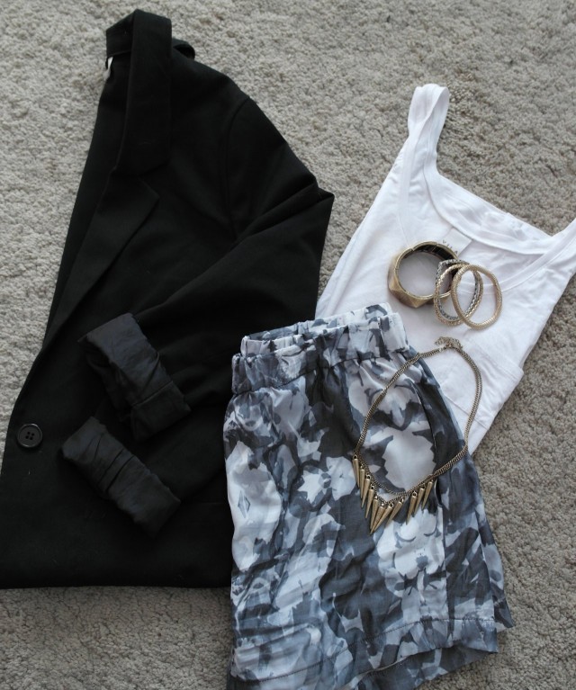 Tiistaina olikin nopeampi tahti lähteä vapun viettoon. En tietenkään ollut katsonut valmiiksi vaatteitani ja olin 10-18 töissä, siispä ruokatunti meni juostessa vaatekaupoissa etsien jotain päälle pantavaa. Löysin Selectediltä hauskat ysäriin taipuvat löysät pussishortsit. Korkealla vyötäröllä varusteltu pussimalli toimii hyvin jonkin niukan topin kanssa, siispä nappasin Vilalta perus valkoisen alustopin. Niitä tarvitsee aina. Onneksi mukana oli H&M boyfriend-mallinen jakku ja siitä sain koottua hauskan asukokonaisuuden. Kuvaaja oli jo valitettavasti vappu fiiliksissä joten kuvia en saanut.