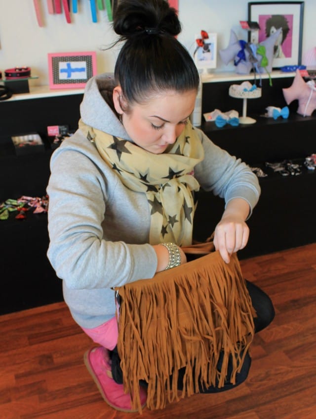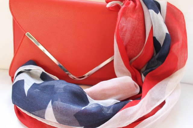 Aiempi Usa-huivi myytiin loppuun… Samaa ei ollut enään saatavilla. Eipä oo paha tämäkään versio! Ja punainen vähän isompi kokonen kirjekuorilaukku kylkeen.