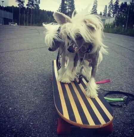 Voisi kuvitella, että kun kuvassa on mun koirat skeitin päällä, että meikäläinen skeittaa… No, totuus kuitenkin on, ettei se ole mun lauta, enkä mä skeittaa VAAN MUN NELIKYMPPINEN ÄITI ! 😀 kyllä vain. Tossa se rollaa pari kertaa viikossa mun pikkuveljien kanssa työmaan takaparkilla. Tälläsessä pienessä "kylässä" tollasella touhulla helposti leimataan kylähulluksi tai katotaan muuten oudoksuen…Harrastushan se on muiden joukossa? 😀
