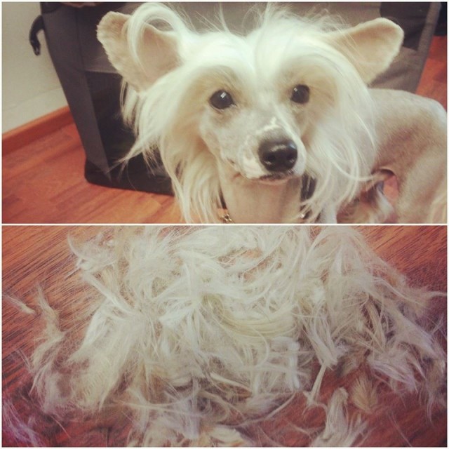 Trimmatut korvat ja tuloksena kilo karvaa lattialla. (After)