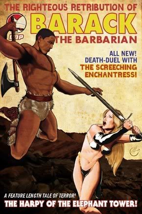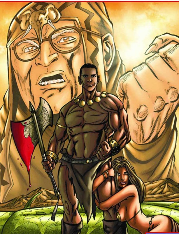 Obama on suuri Conan Barbaari -fani. Niinpä oli välttämätöntä tehdä lehti, jossa Obama seikkailee barbaarina. Esikuvalleen syvään kumartavassa lehdessä Barack Barbaari seikkailee Yhdysvaltain politiikkakuvioista tuttujen, barbaarimaailmaan siirrettyjen hahmojen kanssa. Näkyvin sivuhahmo on bikineissä ja sudentaljassa keikistelevä Red Sarah. Mukana pyörivät myös [B]Hillary[/B] miehineen, [B]George W. Bush[/B], [B]Dick Cheney[/B] ja [B]John McCain[/B]. [B]Larry Haman[/B] käsikirjoittamaa sarjista on ilmestynyt neljä osaa. Hama suostui projektiin sillä ehdolla, että kyseessä olisi oikea, vakavasti otettava sarjakuva eikä pelkkä kunnianhimoton läppä. Ensimmäisenä pitäisi muuttaa lehden tyhmä Obama the Barbarian -nimi muotoon Barack the Barbarian. Kiitos Haman vaatimusten, lehden piirrosjälki on tyylikästä ja tarinakin mukiinmenevä. Tämä on ihan oikea sarjakuva.