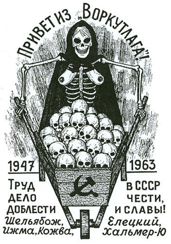Tässä kuvassa on vuonna 1962 tehty tatuointi, jossa pilkataan neuvostosysteemiä ja vankileirien propagandaa. Kantaja kertoo tatuoinnilla selvinneensä useasta erityisen pahamaineisesta vankileiristä. Teksti kuuluu suomeksi suunnilleen ”Terveiset Vorkutan leireiltä! 1947-1963. Neuvostoliitossa työ on kunnian, sankaruuden ja maineen asia. Shelyabozh, Jeletskij, Izhma, Kozhma, Eteläinen Halmer.”
