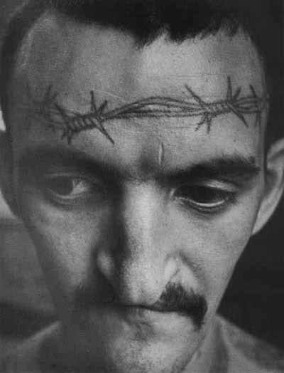 Otsaan tatuoitu piikkilanka kertoo, että vanki on tuomittu elinkautiseen. Tässä tapatuksessa se todellakin tarkoittaa loppuelämää, ei 12 vuotta, joka on suomalaisen elinkautisen kesto.