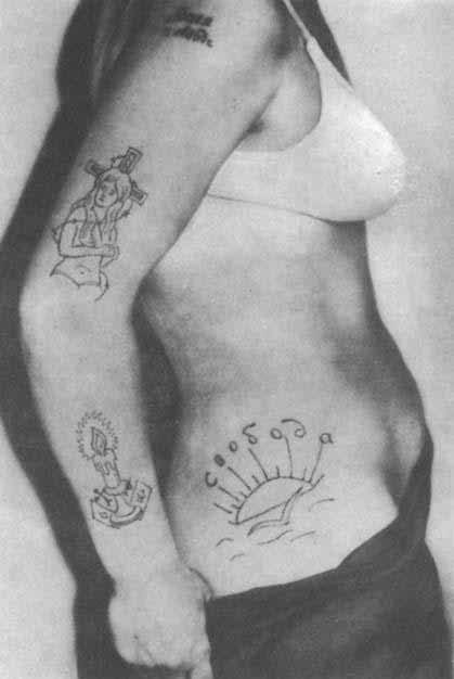 Tässä kuvassa on vuonna 1962 tehty tatuointi, jossa pilkataan neuvostosysteemiä ja vankileirien propagandaa. Kantaja kertoo tatuoinnilla selvinneensä useasta erityisen pahamaineisesta vankileiristä. Teksti kuuluu suomeksi suunnilleen ”Terveiset Vorkutan leireiltä! 1947-1963. Neuvostoliitossa työ on kunnian, sankaruuden ja maineen asia. Shelyabozh, Jeletskij, Izhma, Kozhma, Eteläinen Halmer.”