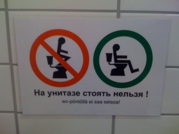 Ohjeet ovat lappeenrantalaisesta ostoskeskuksesta ja esittävät sen, miten asiaa ei ole tapana hoitaa meillä Suomen puolella. Toisaalta onhan kyykkääminen suurkaupungeissa luonnollisesti kliinisempää kuin pöntön reunalle istuminen ja kyllä Itä-Euroopassakin suositaan paikoittain vielä aasialaista ratkaisua. Tämä Kiovasta: