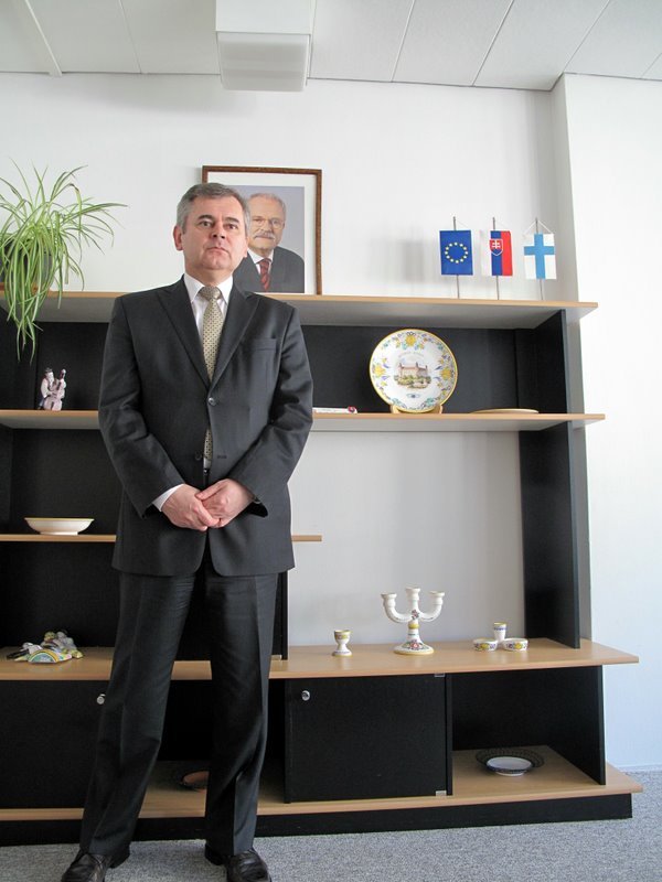 Pyydän herra H. E. Juraj Podhorskýä asettumaan valokuvaan Slovakian presidentin kanssa.Samaan aikaan neiti Zuzana Volovarova käy hakemassa brosyyreja toimistosta.