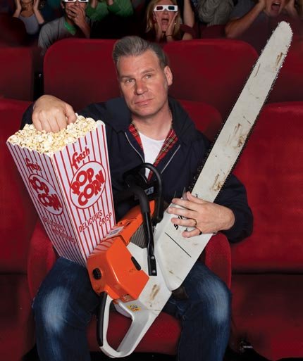 (Kovamunainen brittikriitikko Mr. Kermode alla kuvassa moottorisahasta vasemmalla.)