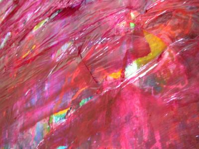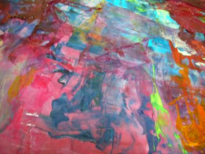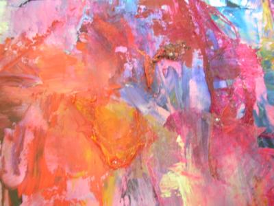 Suurta kangasta on vaikea hallita katseella. Täytyy tutkia kohta kerrallaan, sitten taas yrittää nähdä koko taulu, katsoa, mitä värit sanovat toisistaan, mitä toivovat seurakseen. Kiusaako joku toista, kuka uikuttaa apua? Lähestyn ja kosketan, raaputan, tutkin sivusuunnasta.