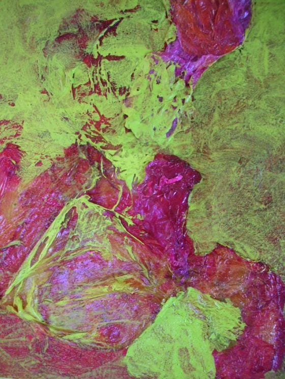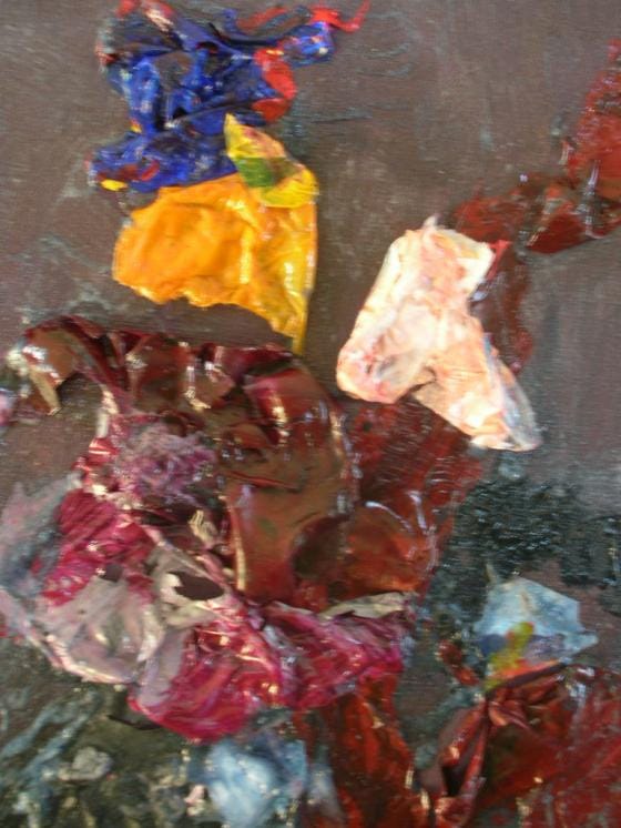 Siinä missä iso maalaus on maailma, pieni on enemmän olio. Sitä maalaa lattialla, jalat ristissä, välillä sen voi ottaa syliin. Alkuun oli vaikea tehdä pientä vauhtihuutospektaakkelimaalauksen jälkeen. Tuntuu hassulta askartelulta. Vaikka osaavat nämäkin tekeleet itkettää. Jotain pillitin viime yönä klo 1-2. Olen maalannut liikaa, nukkunut liian vähän viime päivät, se on selvä.