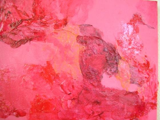 Unen tilalla on värejä. Sillä ensin tulee keltainen, sitten oranssi ja sininen. Seinä loppuu, kääntyy, tulee syvennys, gallerian painokkain paikka; siinä on pinkki taulu, näyttelyn suurin maalaus. Seuraavan seinän alkuun jätetään reilusti tyhjää. Sitten musta-kelta-vihreä Kuume, kaikenvärinen Tuonen tarha ja kolmantena viiniä ja violettia. Ikkunaseinä: turkoosi ja keltainen. Aamulla kaikki kiinnitetään seinään. Lisäksi ajattelin aksentteja pienillä tauluilla, mihin tarkalleen, minkä värisiä, jää nähtäväksi.