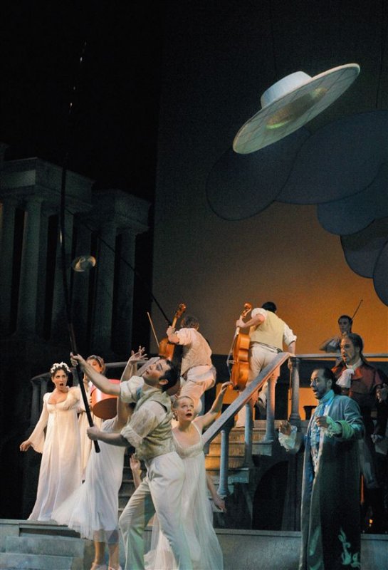 Dario Fon ohjaus on huippuhieno. Siinä on jatkuvaa säpinää, ja kylpylän yllä keinuu ja kiipeilee akrobaatteja. Parempaa versiota Matka Reimsiin -oopperasta ei voi olla olemassa.