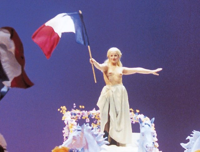 Magda ja Ruggero kohtaavat. He rakastuvat. He laulavat sydämensä riemusta. Lavalle ryntää can-can-tanssijoita helmat korvissa. Kaiken yläpuolella heiluttaa Ranskan lippua vaalea nainen rinnat paljaina. Voittaa kotiolot, tuumin.