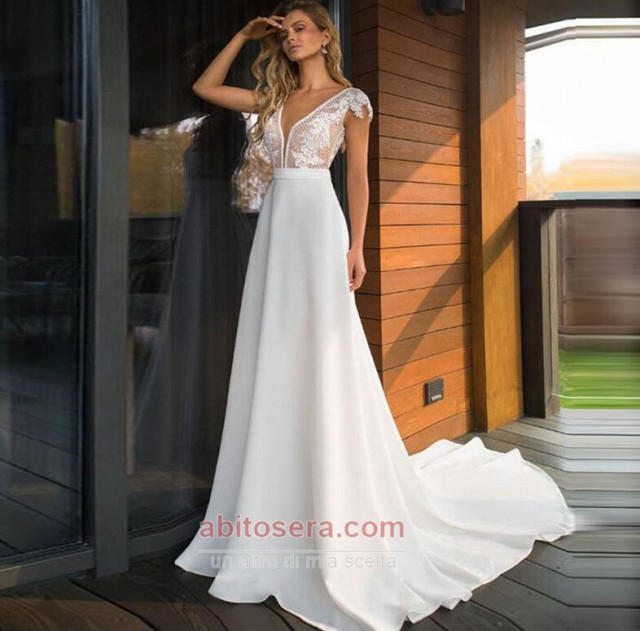 Tanti anche gli stili dalle ispirazioni classiche, come gli abiti da sposa con abiti a trapezio svasato o modelli di abiti da sposa a sirena Abiti da sposa Semplici . Le bellissime maniche sono completamente ricamate con pizzo floreale, ma ci sono anche versioni con corsetto rigido e spalle scoperte, e naturalmente un abito da sposa principessa ricamato con strascico e un prezioso carrè, fasciato da una scollatura pensata per le più romantiche e tradizionali spose.