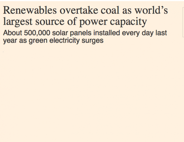 Viime viikolla The Financial Times uutisoi: ”Uusiutuvat ohittavat hiilen maailman suurimpana voimanlähteenä” ja jatkoi alaotsikolla: ”Noin 500 000 aurinkopaneelia päivässä asennettiin viime vuonna vihreän energian jyrkässä nousussa.” Kun kuvituskin koski aurinkoenergiaa, viesti oli vahva.
