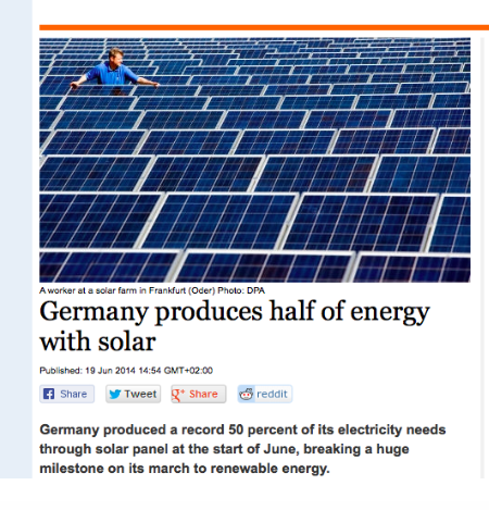 Otsikko ruokki juuri niitä mielikuvia, joita ympäristöjärjestöt mielellään luovat. Kyseessä oli kuitenkin kuvaus vain yhdestä tunnista, ja silloinkin oli kyse sähköntuotannosta, ei energiankulutuksesta. Eräänä aurinkoisena päivänä aurinkoenergia todellakin ylsi 50,6 prosenttiin sähköntuotannosta – yhden tunnin ajaksi. Kyse oli kansallisesta vapaapäivästä, jolloin sähkönkulutus oli tavallista vähäisempää, sekä siitä, että lain mukaan tuulen ja auringon tuotantoa on suosittava maksimiinsa ennen kuin fossiilisia käytetään. Olennaisin virhe tapahtui kuitenkin otsikkotasolla energian- ja sähköntuotannon sekoittamisessa. Vaikka aurinkovoiman osuus on vahvassa kasvussa, epämukava totuus on, että Saksa tuottaa yhä noin 1,5 prosenttia energiastaan aurinkovoimalla.