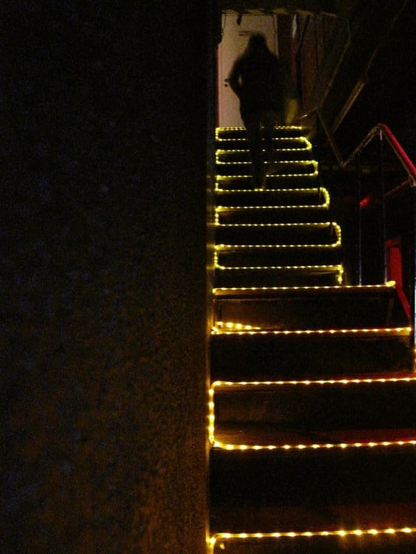 Portaat on reunustettu kebab-ravintoloiden valotauluista tutuilla led-letkuilla. Niitä pitkin horjuu pipopäisiä miehiä: hämärässä he tuovat elävästi mieleen ostoskeskuksen zombiet Dawn of the Deadissä. Yritän naispuolisen kaverini kanssa saada käsityksen alakerran luolaston laajuudesta. Pimeys yltyy ja kaivan taskusta fikkarin. Takaa ilmestyy romeromainen koura ja ääni: TÄMÄ ON BLACK ROOM, EI FIKKAREITA!!