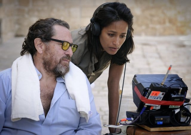 3. Elokuvaa katsellessa voi myös miettiä, onko näyttelijän kansallisuudella väliä, kun on kyse etnisestä draamasta. Palestiinalaista Miralia esittää Intiassa syntynyt ja kasvanut Freida Pinto (yllä olevassa kuvassa ohjaajan kanssa) joka tuli tutuksi Slummien Miljonääristä. Olen nähnyt monia, joiden mielestä tämä on todella feikkiä, yhtä uskottavaa kuin Benicio del Toro Matti Vanhasen roolissa, jos jälkimmäisestä tehtäisiin hänestä kertova elokuva.
