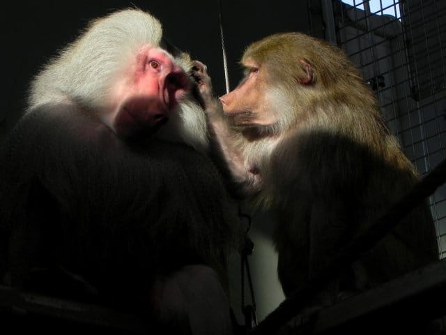 Samaa touhua paviaanien keskuudessa. Tiedä sitten oliko siellä sekä uroksia että naaraita, mutta ihan vahingossa tuli napsaistua kuva rysän päältä. Kuvan otettuani oikein hätkähdin jotta mitä tulikaan otettua 🙂