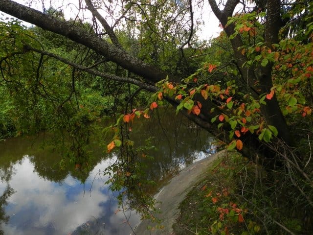 Paluumatkalla pysähdyin joen varteen ihailemaan alkavaa syksyä. No, auto tosin jäi kauas, kun itse rönysin jyrkän penkereen alas, kamera kaulalla kiikkuen. Oli niin tukkoinen ranta, ettei siellä päässyt etenemään. Oli tyydyttävä muutamaan kuvaan…