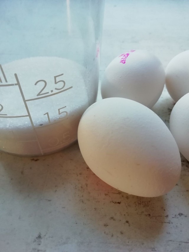 Ensin pitää uskaltautua vatkaamaan munia ja sokeria ja sitten muutaman jauhoisen aineksen yhdistämiseen, sitten niiden sekoitteluun edellisen vatkauksen sekaan – varovasti ja hitaasti! Niinhän nää leivontajutut tehdään. Ja valmistautua säätämään uuni 200 asteen lämpötilaan ja tuotoksen vahtimiseen 10 minuuttia.