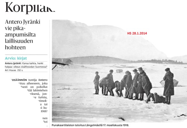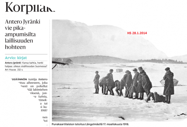 397 surmapäätöstä yhdessä päivässä oli ennätys. 10 000 ’ammutaan paikalla’-teloitusta. ’Ja millähän oikeudella?’ hakee [b]Antero Jyränki[/b] vastausta kirjassaan [i]Kansa kahta, henki halpaa: oikeus sisällissodan Suomessa?