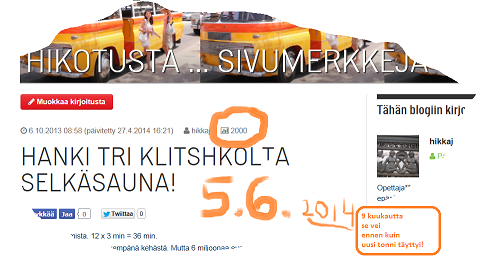 Moniko? Kumpiko? Ja kuka on [url=http://www.blogilista.fi/blogi/hikotusta-sivumerkkeja/112411]tää yks[/url]? [url=http://www.city.fi/blogit/hikkaj/kop+kop+kop/124486]Puolen vuoden krouvissa palloillaan[/url] ja pilkitään, melko tarkalleen. Tuhannes klikkaus [b]Luetuimmissa[/b] ylittyy näinä päivinä, mutta kumpi ehtii ensin: [url=http://www.city.fi/blogit/hikkaj/oma+elama+estradilla/124628][b][i]Katri Helena[/i][/b][/url] (998), kuva yllä,…