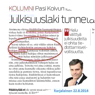 Taipuivat sitten kun lakimieheltä kysyivät ja [url=http://sakasti.evl.fi/sakasti.nsf/sp?open&cid=Content252A14]neuvon[/url] saivat: Nyt on semmoinen piru merrassa ettei auta pullikoida. Ulos on kakistettava salainen tieto – nyt on vastus sitä luokkaa.