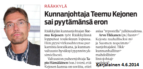 Silti siellä aina jokin mättää, nyt jättää vastavalittu [url=http://www.muurame.fi/fi/urheilustipendit-2013/]Suomen nopein kunnanjohtaja[/url] [b]Teemu Kejonen[/b] heti koeajan jälkeen pikapikaa pallinsa, vapaaehtoisesti. Syyt kerrotaan, mutta kulissien takaisista asioista ei julkisuudessa pukahdeta. Salaisia huomatuksia ei julki tuoda. [i](No niinhän siellä on menetelty ennenkin, I know.)[/i]