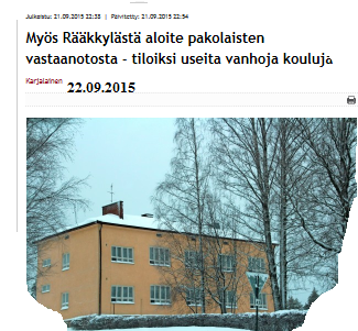 Ja kas kas mitähän näkeekään: Muinaisen opinahjonsa jonka kunta on myynyt parillakybällä pois käsistään haisemasta ja joka nyt on ollut jäätyneenä talvien yli. Joku koulun aikanaan myynyt kunnanmies lienee nyt ostattelemassa sitä takaisin kunnalle ja pakolaisille.