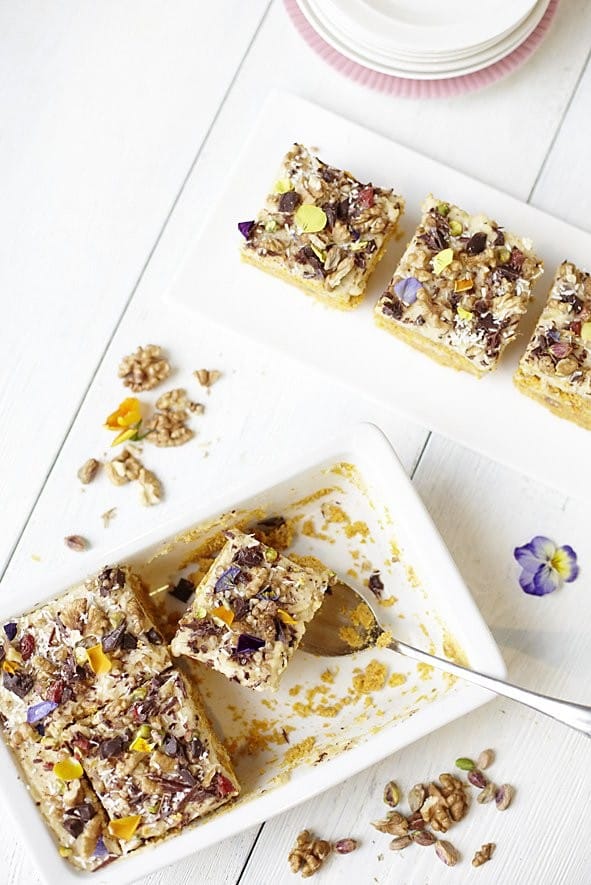 Levitä kakkutaikinasta puolet kakkuvuoan pohjalle. Itse käytin 20×35 kokoista vuokaa. Levittele sen jälkeen kerros cashewtäytettä noin 1/3 osa kakkutaikinan päälle ja laita herkkunen hetkeksi jääkaappiin kovettumaan. Levittele loput kakkutaikinasta ja sen päälle loput cashewtäytteestä kakkuvuokaan, koristele pistaaseilla, saksanpähkinöillä, raakasuklaalla, mulbereilla ja syötävillä kukkasilla ja laita jääkaappiin yön yli jähmettymään ja maustumaan. Tarjoile aamulla sydänkäpysellesi tai ihanille ystäville ja nautiskele aamupalaksi, välipalaksi tai jälkkäriksi.