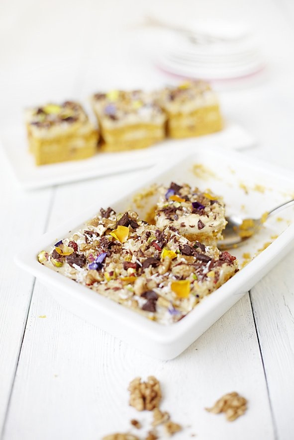 Levitä kakkutaikinasta puolet kakkuvuoan pohjalle. Itse käytin 20×35 kokoista vuokaa. Levittele sen jälkeen kerros cashewtäytettä noin 1/3 osa kakkutaikinan päälle ja laita herkkunen hetkeksi jääkaappiin kovettumaan. Levittele loput kakkutaikinasta ja sen päälle loput cashewtäytteestä kakkuvuokaan, koristele pistaaseilla, saksanpähkinöillä, raakasuklaalla, mulbereilla ja syötävillä kukkasilla ja laita jääkaappiin yön yli jähmettymään ja maustumaan. Tarjoile aamulla sydänkäpysellesi tai ihanille ystäville ja nautiskele aamupalaksi, välipalaksi tai jälkkäriksi.