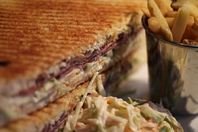 Kävin täällä syömässä Reubenin, joka oli aivan jäätävän kokoinen, ja maultansa yksi parhaita koskaan syömiäni täytettyjä leipiä. Listan isoimpana siitä riittäisi syötävää kahdelle. Kannattaakin varmaan jakaa tai hakea tälläinen mukaan. Muut listan leivät toki ovat pienempiä.
