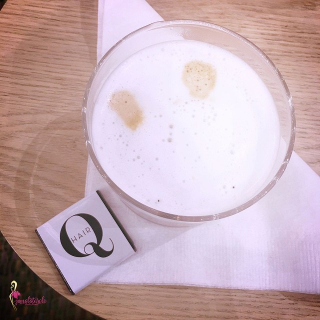 Hoidon alussa Piritta levitti ykkösvaiheen Olaplex-aineen kuiviin hiuksiini, ja antoi sen vaikuttaa. Vaikutusajan jälkeen hiuksiin levitettiin kakkosvaiheen Olaplex-aine, joka sai vaikuttaa pyyhkeen alla. Samalla nautin ihanaa cappucinoa ja nautin pesupaikan hierovasta tuolista. On ihan mahtavaa, miten Q-hairissa samalla saa hemmottelua hiuksille ja kaikille aisteille!
