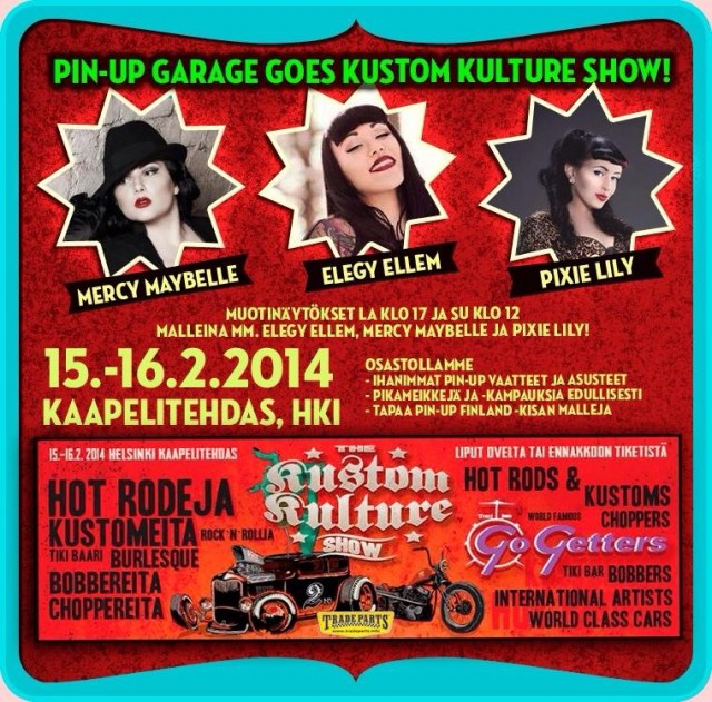 Menneenä viikonloppuna Kaapelitehtaalla järjestettiin Kustom Kulture Show -tapahtuma. Tapahtumassa oli näytillä upeita rakenneltuja autoja ja moottoripyöriä, sekä paljon käsityöläisiä ja kustom kulture-elämäntapaan linkittyviä myyjiä. Myös Pin-Up Garage oli mukana tapahtumassa omalla osastollaan.