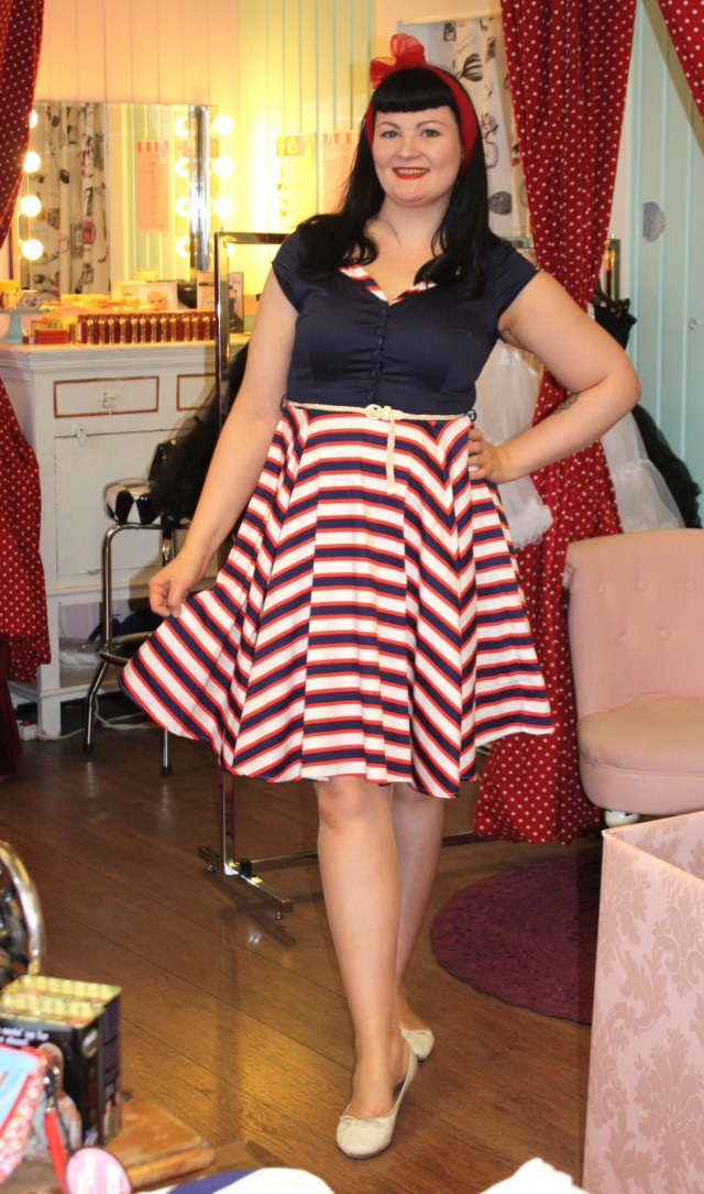 Tämä mekko on minulla usein lainassa kuvausvaatevalikoimastamme. Mekko on ollut meillä putiikin valikoimassa, ja uskoisin että ostan sitä taas lisää myyntiin: Mekko on amerikkalaisen Pinup Couturen mallistoa, joka on meillä Pin-Up Garagessa yksinmyynnissä. Mekko korostaa kauniisti naisellisia kurveja ja edustaa hieman seksikkäämpää seilorityyliä.