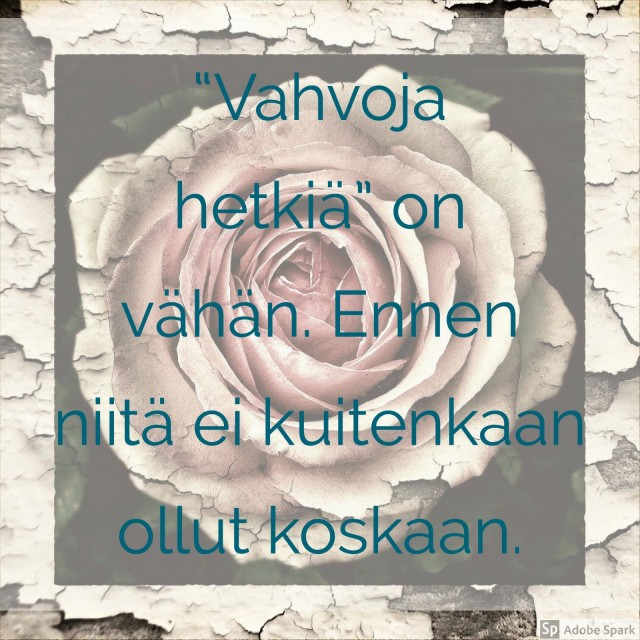 Kirjoitan tästä siksi että minut on viime viikkojen, varmaan vuosienkin aikana leimattu vain ja ainoastaan menneisyyteni kautta. En ole selviytyjä. En ole parantunut. En ole mitään noista. Olen ikuisesti mielenterveyskuntoutuja. Menen ehkä hitaasti eteenpäin, mutta ympärillä olevat ihmiset eivät anna sille mitään arvoa. Annanko itse? Toisinaan. Harvoin. "Vahvoja hetkiä" on vähän. Ennen niitä ei kuitenkaan ollut koskaan.