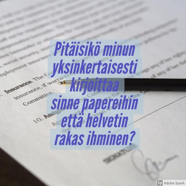 Olisi mielestäni reilua että me, joiden perhekäsitys on jotain muuta kuin isä, äiti ja kaksi lasta, emme joutuisi koko ajan selittämään tilannettamme tai puolustamaan valintojamme. Käytännössä minulla on siis kaksi isää, yksi äiti (joka on kuollut), kaksi aikuista sisarusta, jotka elävät omaa elämäänsä, ja kaksi pientä pikkuveljeä, joille ostelen lahjoja silloin tällöin. Sairaalan papereihin täytyy kirjoittaa lähiomaisen nimi, jolloin minä kirjoitan sinne tämän ohjaajan eli Wallen nimen. Ongelma tulee siinä kohtaa, kun hänen statustaan pitäisi alkaa määrittelemään. Hän on huomattavasti enemmän kuin ystävä, mutta virallisissa papereissa en voi häntä isäkseni kirjoittaa, sillä olen virallisesti täysi-ikäinen, joten minua ei voi adoptoida. Pitäisikö minun yksinkertaisesti kirjoittaa sinne papereihin että helvetin rakas ihminen? Huvittavimpia tämän asian suhteen ovat ihmiset, jotka ajattelevat, että lapsen perheessä pitää olla äiti ja isä. Äitini kuoli kun olin kymmenen. Ehkä siksi minusta ei ole tullut kovinkaan naisellista persoonaa, mutta en minä silti ihan pieleen ole kasvanut. Olen hyvä koulussa ja hyvin sosiaalinen oppilas. Miehen ja naisen mallia voi saada muualtakin kuin ydinperheestä. Mielestäni on korkea aika siirtyä myös lainsäädännöllisesti siihen ajatteluun, että ne ihmiset, jotka vastaavat lapsen ja nuoren, ja joissain tapauksissa myös aikuisen hyvinvoinnista, kuuluvat myös juridisesti tämän perheeseen. Tietysti kyseessä olevan ihmisen omalla suostumuksella.